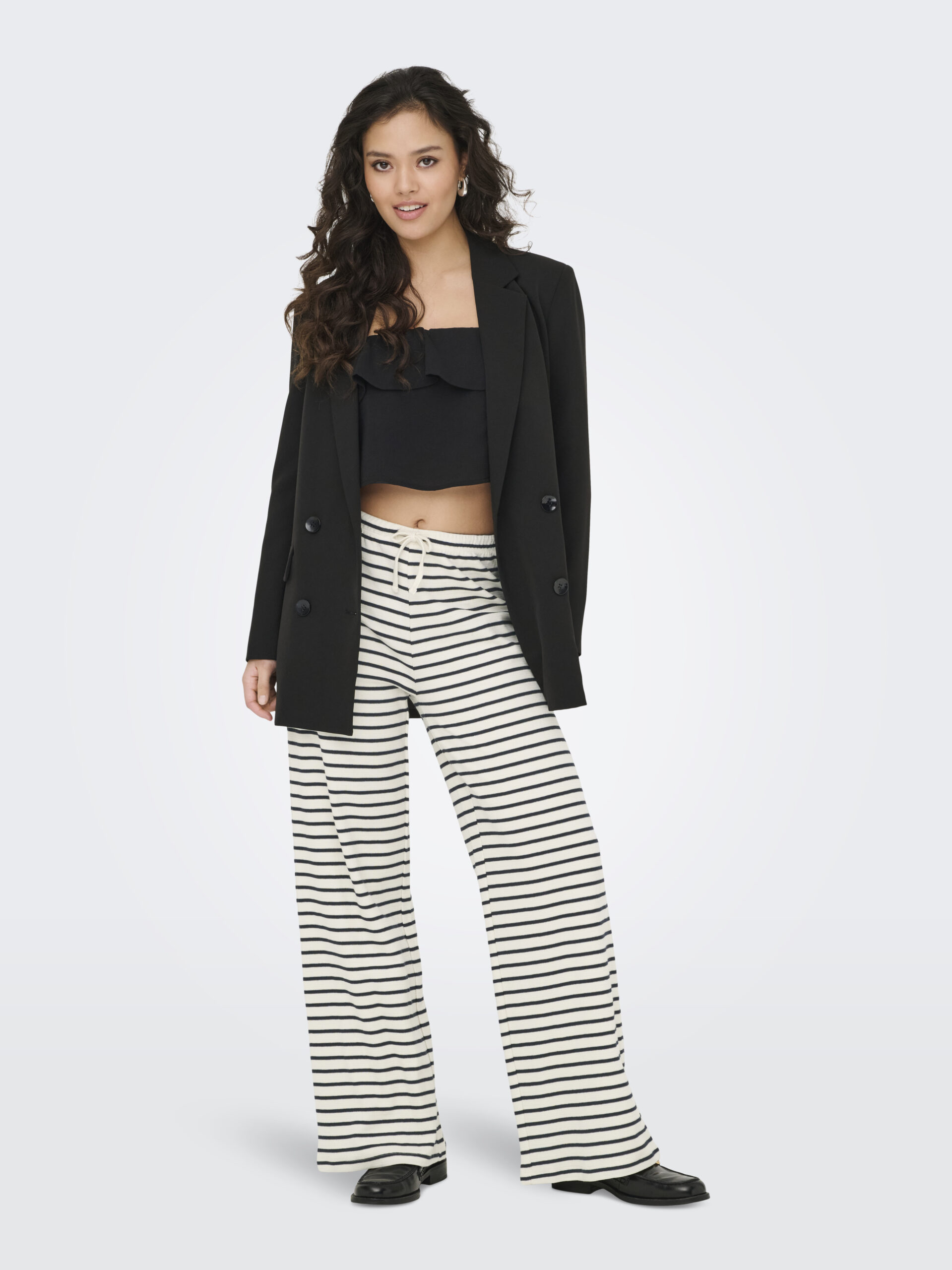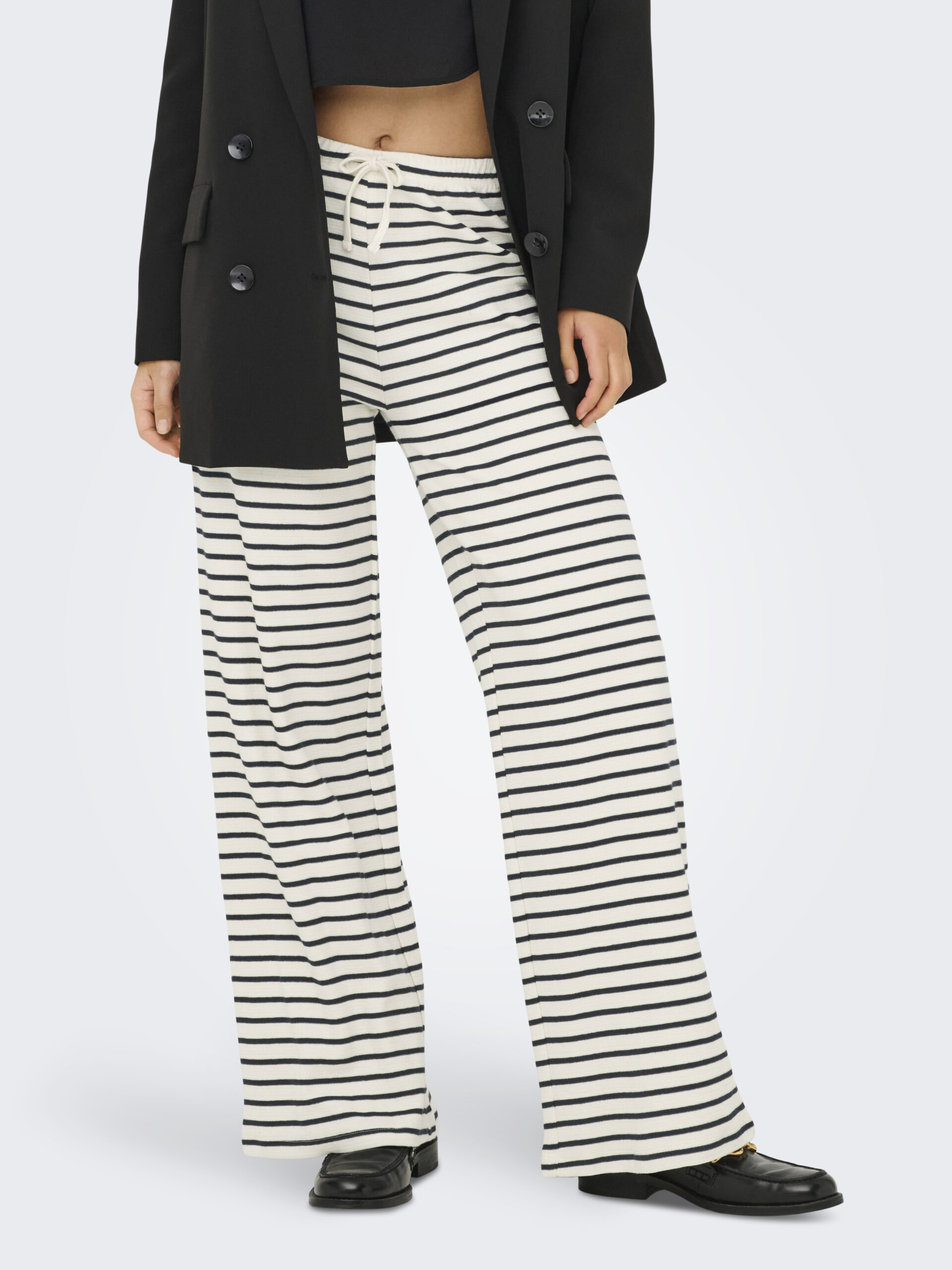 Lækre stribede bomulds bukser fra JDY, med elastik i livet der findes en polo t-shirt der til, et skønt hyggesæt
