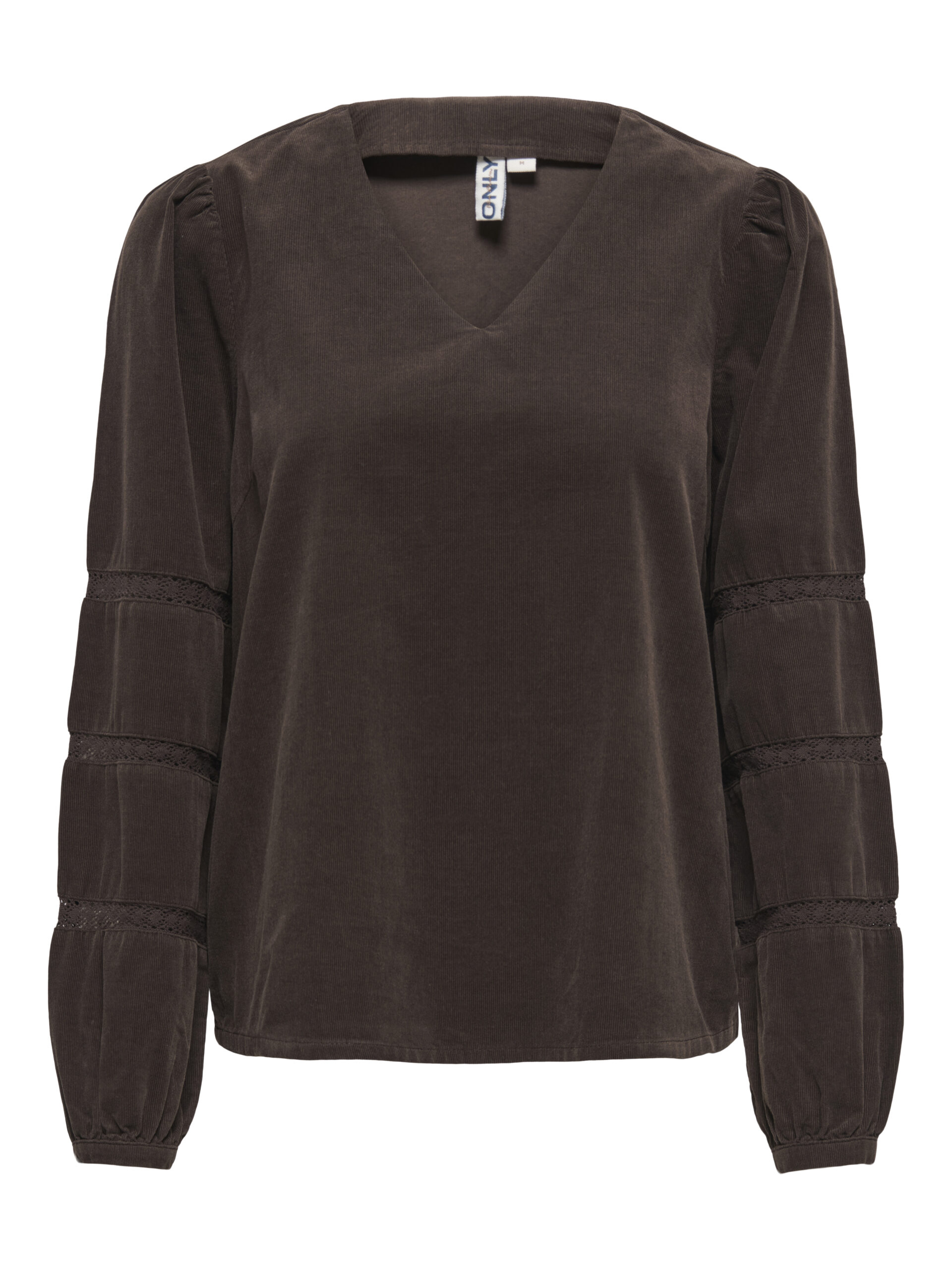 Sød bluse i brun fløjl fra Only, med fine blondedetaljer på ærmerne.
