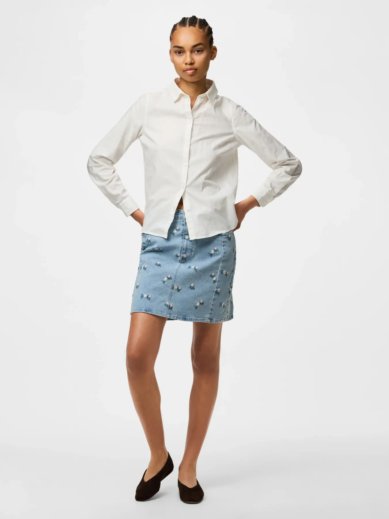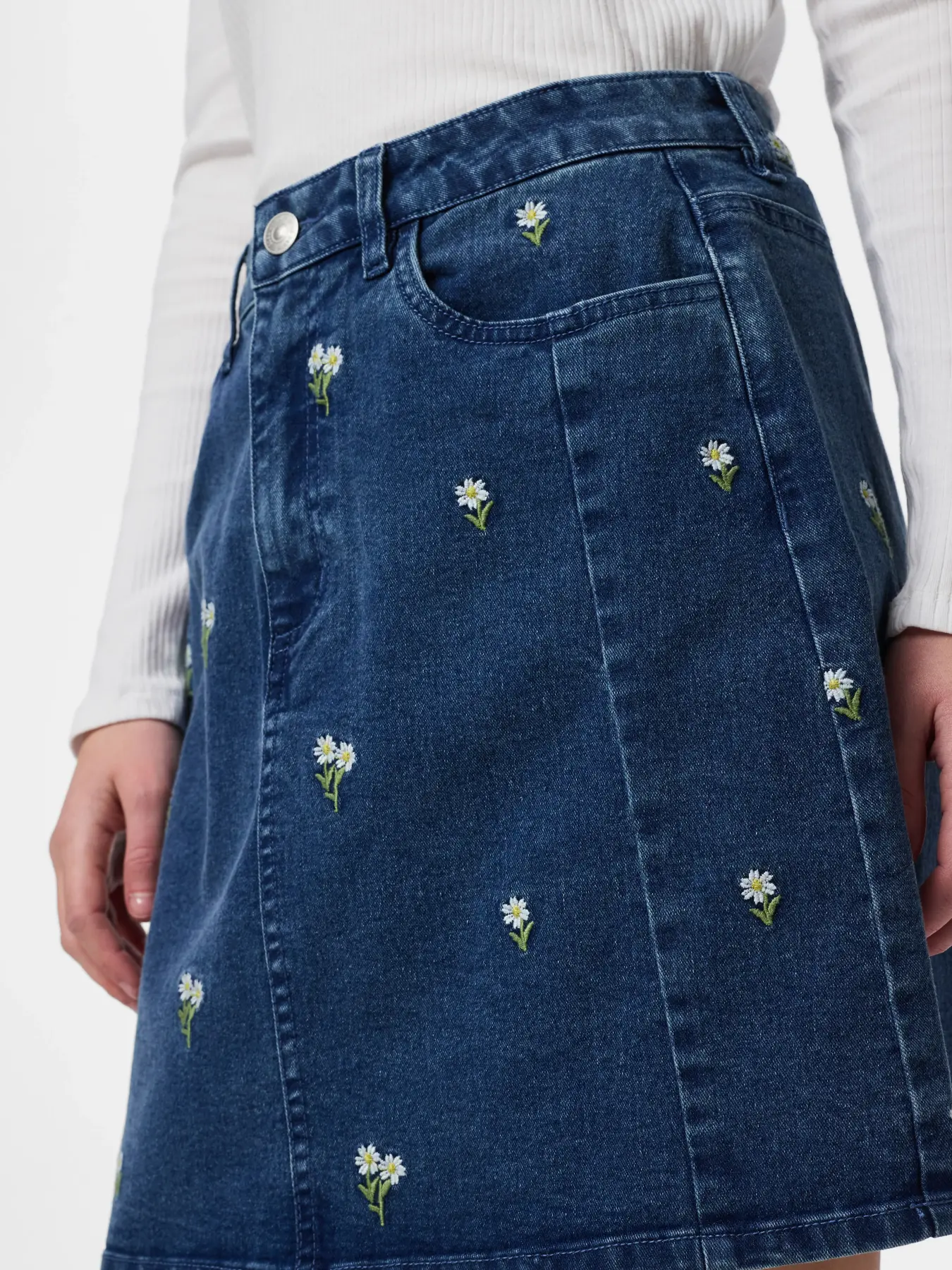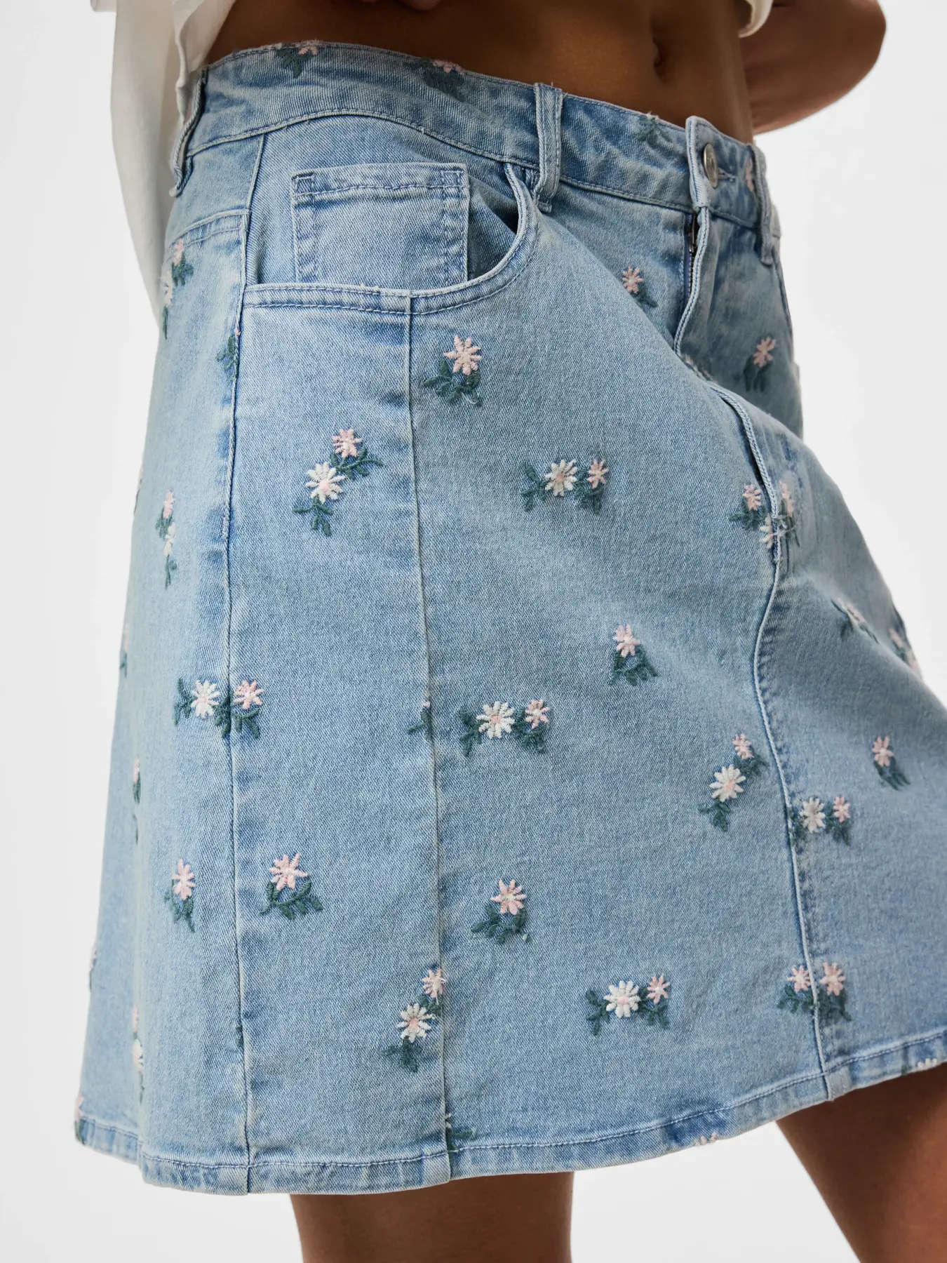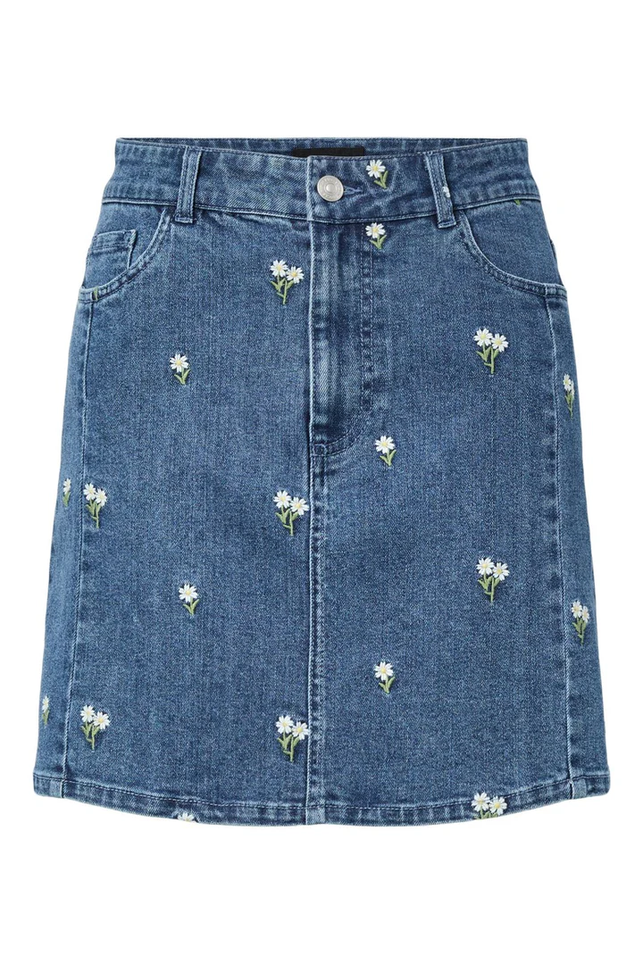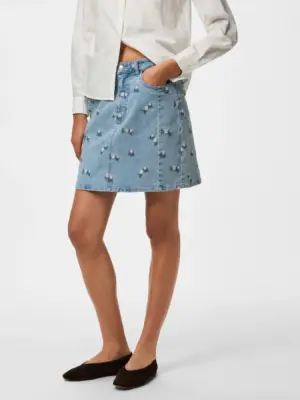 Mega cool denim skirt fra PIECES, med blomster broderi.