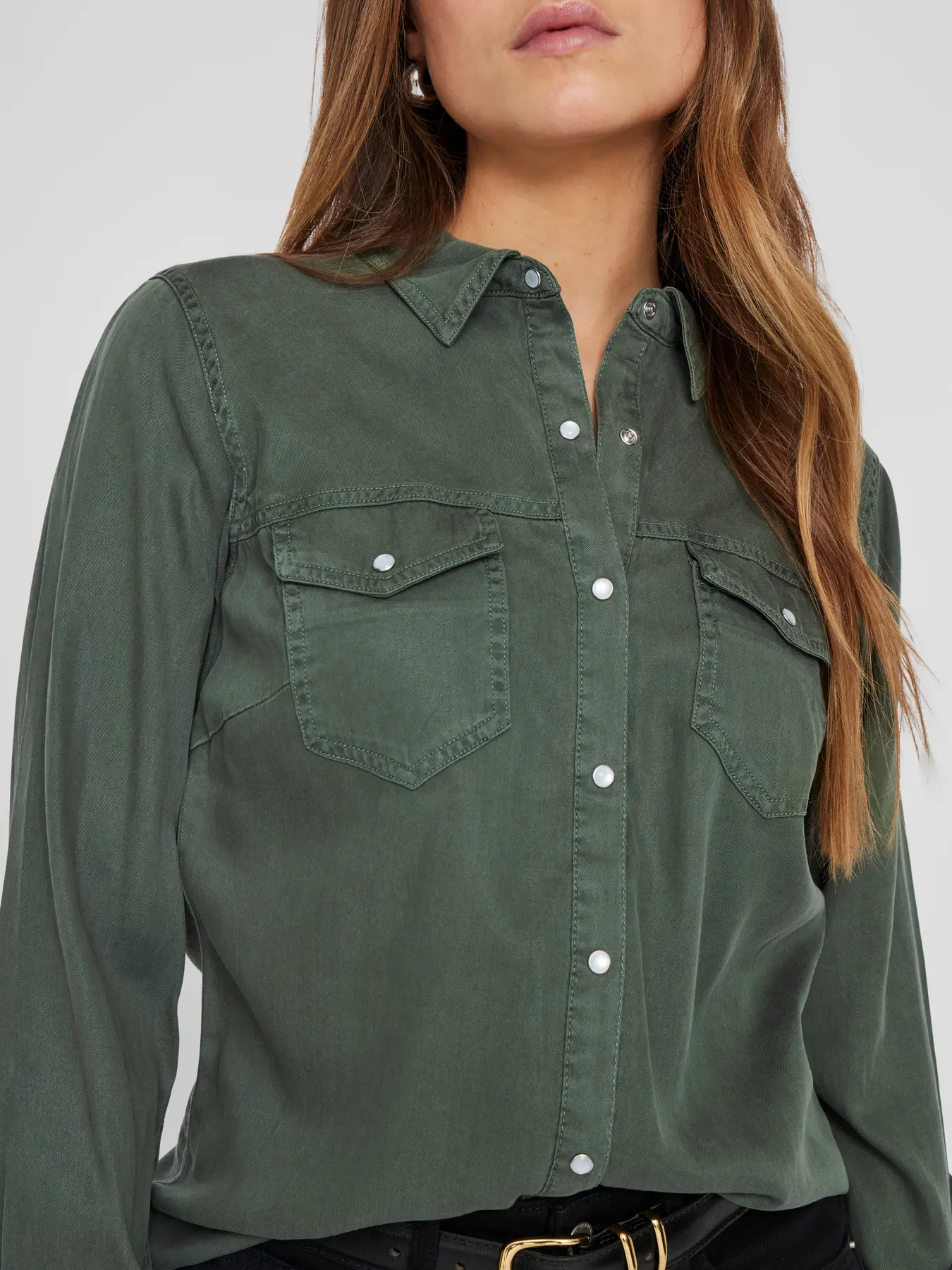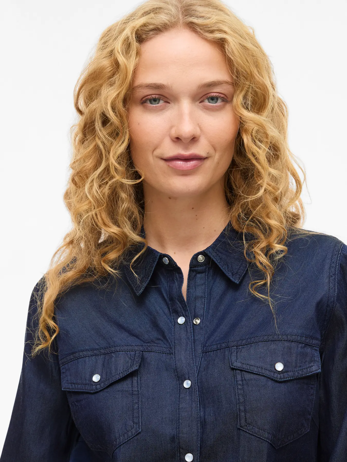 Virkelig fed denimskjorte fra VILA. Det er en klassisk denimskjorte med trykknapper, brystlommer og alm. skjortekrave. Denimskjorten kan bruges både åben og lukket, og giver derfor et hav af muligheder for at style den.