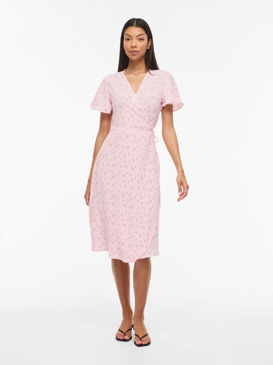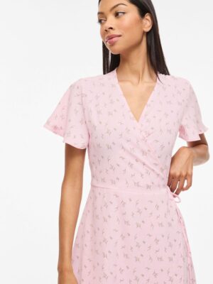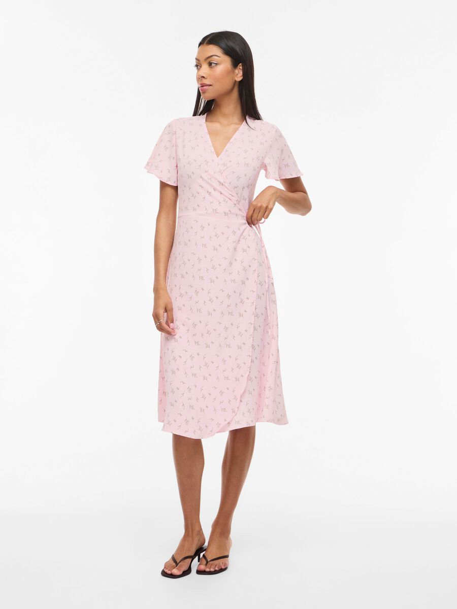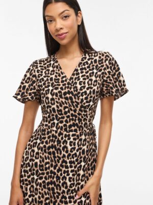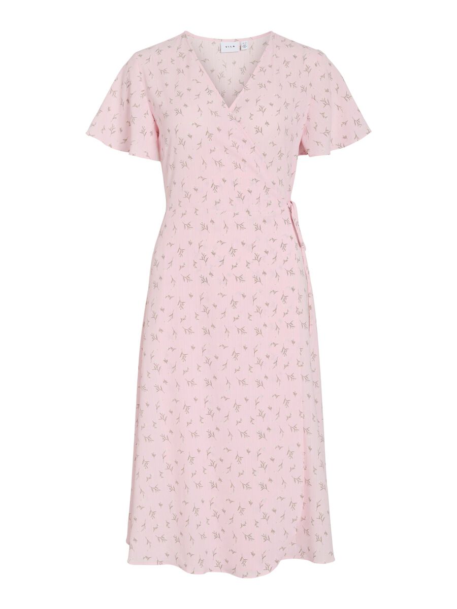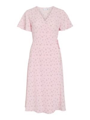 Fin lang slå om kjole fra VILA med mønster, med V-hals og korte ærmer.